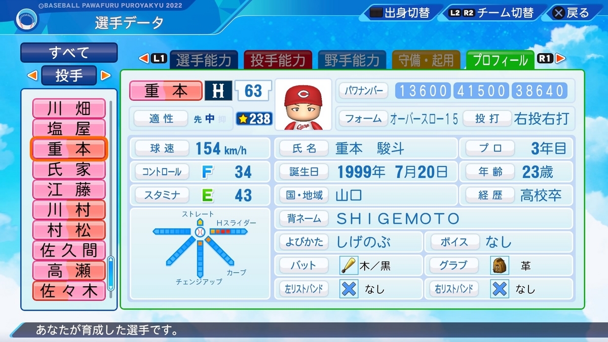 まだ変化球や制球力に粗が残りますが、23歳と若くこの先成長していけば面白い存在になれるはずの若手投手です。がんばって育てましょう。