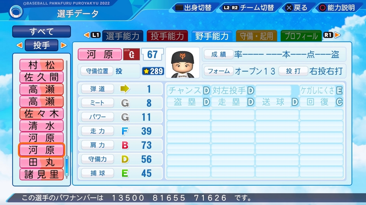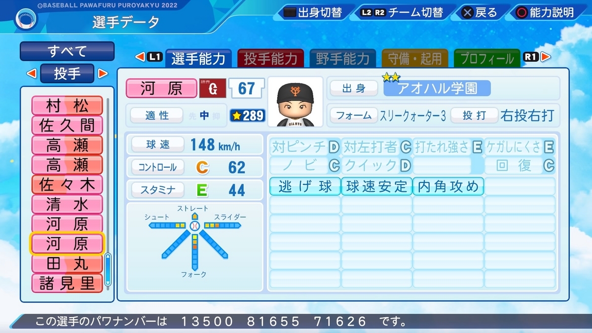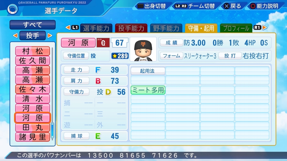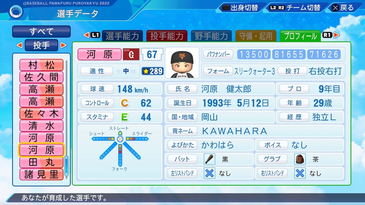 大阪投手陣においては安定した成績を見込めるんじゃないかな、と思う能力を持っています。ただ周りが心もとないので、使い潰さないように注意。
