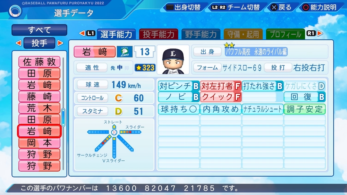 ここ数カ月の言説で「ドラフト2位に(明らかに)救援が主戦場だった投手を取るのはどうなのか」と言うのを目にして「確かに」とは思いましたが…………岩﨑のキャラメイク時には触れていなかったのと、大学時代に救援が主でもドラフト1位で指名された選手もいなくはない(福岡ソフトバンク・甲斐野央、元埼玉西武・大石達也など)ので、「まあええか…………」とはなっています。