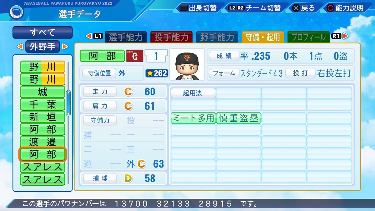 近年の査定でミートCはなかなかないんですが、条件によってはベテランには甘くてもいいと思っているので、今季の阿部はこんな感じ。例えば「(苦手な)左投手相手にはほとんど起用されなくて、結果高打率の打者」みたいな起用法でも、打率3割を残せたらそこは「あってもいい」んじゃないかなと。