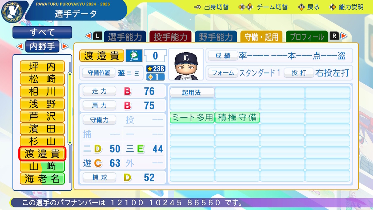キャラメイクはまあ、よくある「ギャップ萌え」です(萌え?)。ドラフト4位にしてはえらく高い能力だとも思いますが、査定がシーズン終了時想定なのもあるけども、それだけ評価が高い守備力を有しているということです。その分打撃力に明確な課題はありますがね。