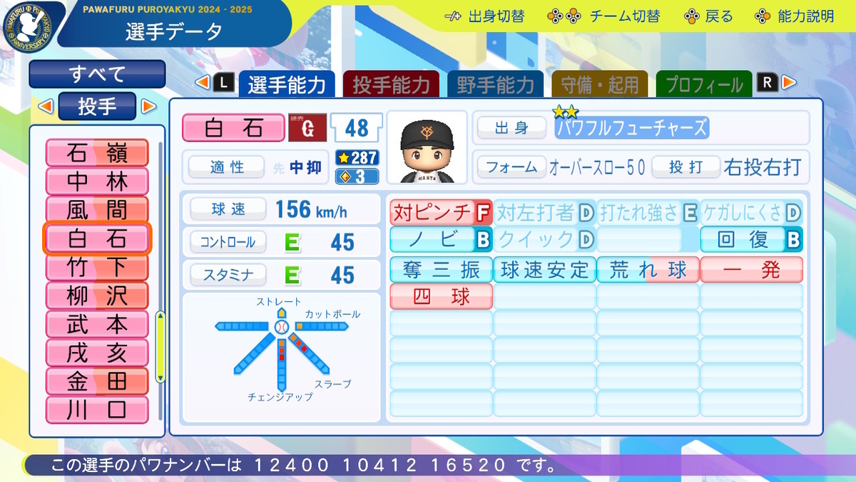 「ポテンシャルはあるんですけどねぇ…………それこそクローザーを任されるくらいの…………」と、とかく歯がゆい投手です。制球力もそうだけど、メンタルも要改善かも。
