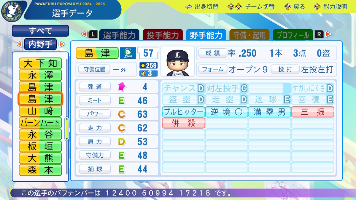 能力は純然たるスラッガーのそれです。この手のタイプにしては珍しく足が遅くないので、モノになった時の破壊力は相当期待したいですね。